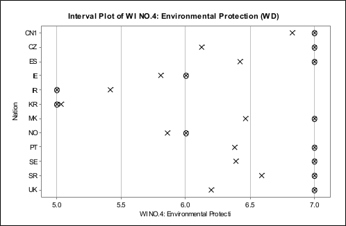 Environmental ProtectionWe conducted an international survey about this issue in 12 nations between 2007 to 2008. The 12 nations were: China (mainland), Czech Republic, Iran, Ireland, Macedonia, Norway, Portugal, Serbia, South Korea, Spain, Sweden, and the United Kingdom. In total 4,514 questionnaires were received. The perceived importance of the issue differs in different nations. Below is the results. The cross is the mean, The cross in a circle is the median. Having the symbol on the right side means it is considered more important in the nation.