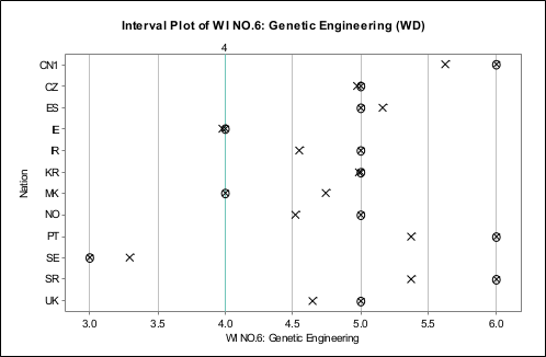 Genetic EngineeringWe conducted an international survey about this issue in 12 nations between 2007 to 2008. The 12 nations were: China (mainland), Czech Republic, Iran, Ireland, Macedonia, Norway, Portugal, Serbia, South Korea, Spain, Sweden, and the United Kingdom. In total 4,514 questionnaires were received. The perceived importance of the issue differs in different nations. Below is the results. The cross is the mean, The cross in a circle is the median. Having the symbol on the right side means it is considered more important in the nation.