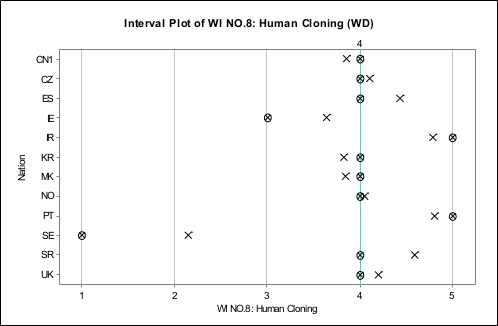 Human CloningWe conducted an international survey about this issue in 12 nations between 2007 to 2008. The 12 nations were: China (mainland), Czech Republic, Iran, Ireland, Macedonia, Norway, Portugal, Serbia, South Korea, Spain, Sweden, and the United Kingdom. In total 4,514 questionnaires were received. The perceived importance of the issue differs in different nations. Below is the results. The cross is the mean, The cross in a circle is the median. Having the symbol on the right side means it is considered more important in the nation.