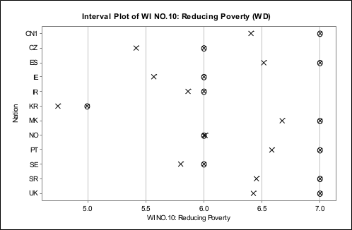 Reducing PovertyWe conducted an international survey about this issue in 12 nations between 2007 to 2008. The 12 nations were: China (mainland), Czech Republic, Iran, Ireland, Macedonia, Norway, Portugal, Serbia, South Korea, Spain, Sweden, and the United Kingdom. In total 4,514 questionnaires were received. The perceived importance of the issue differs in different nations. Below is the results. The cross is the mean, The cross in a circle is the median. Having the symbol on the right side means it is considered more important in the nation.